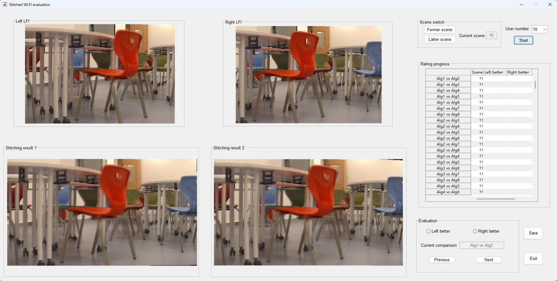 该研究工作首先构建了国内第一个拼接宽视场光场图像主观质量基准数据集,该数据集包含40组待拼接源光场图像,由Lytro illum光场相机通过“旋转”和“旋转+平移”两种不同方式采集,并采用8种代表性的图像拼接算法,生成320幅拼接宽视场光场图像。主观质量评价实验采用成对比较打分方案,并使用Bradley-Terry模型生成最终的主观质量分数,主观评价可视化界面如图1所示。
