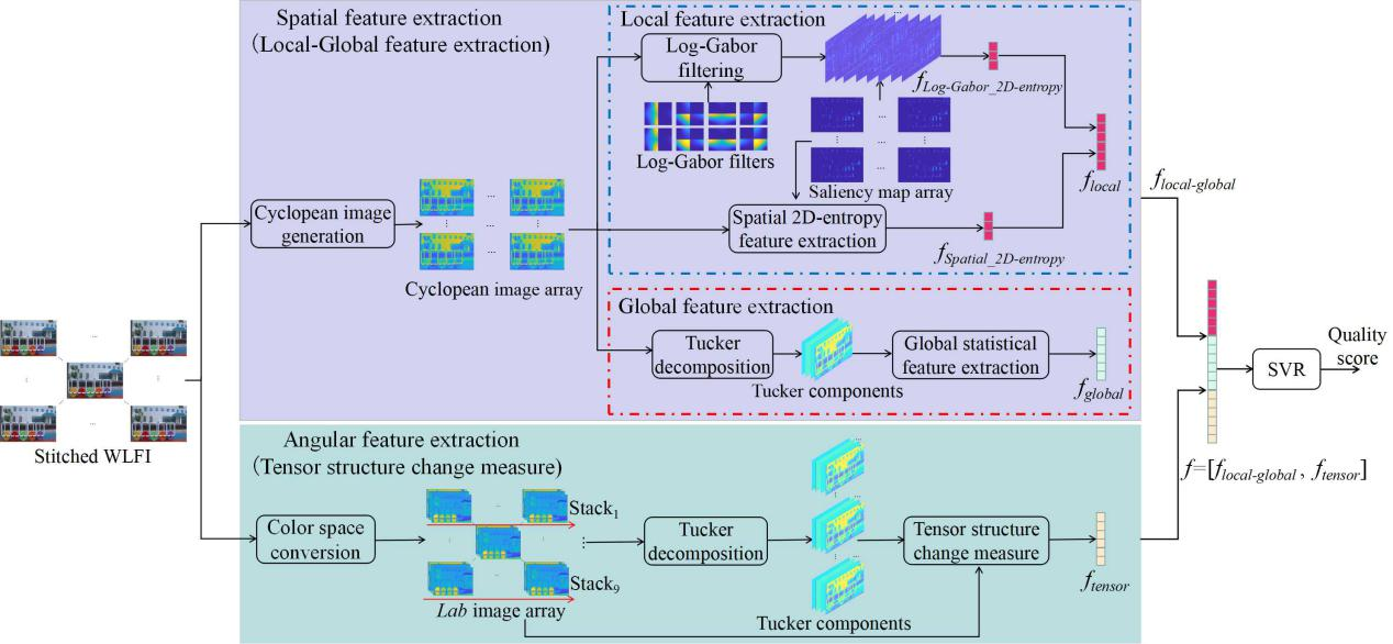 同时,该研究工作还提出了一种新颖的面向拼接宽视场光场图像的无参考客观质量评价算法(如图2所示),其能自动有效地评价拼接宽视场光场图像的视觉质量,且与人眼视觉感知系统保持较高的相关性。该研究成果有望应用于未来新型沉浸式宽视场光场成像内容的实时质量监测及优化。