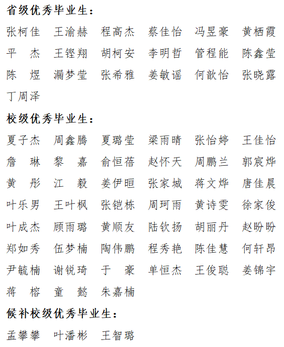 根据《PA捕鱼官网入口本科生评优奖励办法》,经班级推荐、学工办审核、公司党政联席会议研究决定,决定推荐张柯佳等19位同学为省级优秀毕业生人选,夏子杰等45位同学为校级优秀毕业生人选,孟攀攀等3位同学为候补校级优秀毕业生人选。具体名单如下: