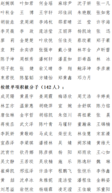 根据《PA捕鱼官网入口本科生评优奖励办法》,经个人报名、各班推荐、学工办审核、公司党政联席会议研究决定,推荐黄昭阳等51位同学为校级三好员工人选,陈温生等59位同学为校级优秀员工干部人选,成灵珊等142位同学为校级单项积极分子人选,现予以公示。