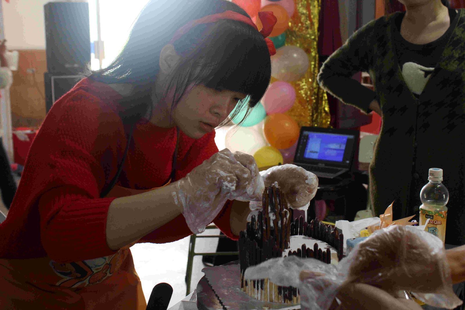 本次比赛分团体组与情侣组共同进行。持续了将近四个小时。参赛选手十分积极,虽然蛋糕制作时间仅为短短的45分钟,但是选手们均充分发挥了自己的想象力,一个个精美的蛋糕被慢慢的塑造了出来,个个如果专业制造一般。最后,经过评委们的评定,黄梦婷组、胡巧巧组分别摘得团体组、情侣组桂冠。