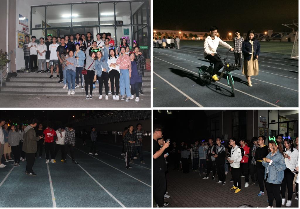 本次荧光夜跑活动分为荧光夜跑、自行车慢骑、结对而行、荧光投石和抽奖环节五个环节。在每个环节中各小组队员集思广益,团结协作,大家各显神通,通力合作,接连成功闯关。活动中,同学们与荧光为舞,与明月为伴相约奔跑,不仅陶冶了情操、锻炼了身体、放松了心情,更在欢乐的氛围中享受到了运动的乐趣,增进了同学间的友谊。