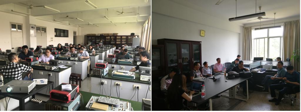 各系围绕主题开展了精彩纷呈的活动。物理系开展说课程活动。蔡培阳老师就说课程要体现“员工中心、产出导向、持续改进”;姜涛老师就说课程应体现“说内容、说教法、说学法、说评价”四个环节;梁华秋老师就说课程应体现“与专业的结合、信息化教学手段”等进行了研讨。计算机系、数学系和电子系每位老师就各自承担课程的整体设计和本人进行课程整改的情况以及教学特色、教学理念、教学艺术和教学功底、课程开设的必要性、教学内容的选取与序化、教学方法与教学手段、课程考核方式和综合素质等多方面进行探讨。