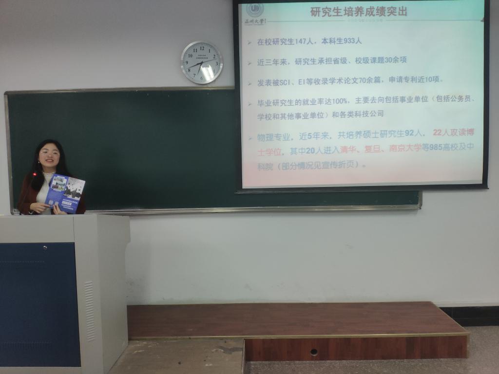 为深入贯彻落实公司“申硕,升格,创一流”的发展战略,加强公司学风建设,提高公司员工考研的热情,使员工了解更多考研信息,11月17日pa捕鱼官方网站物理学研究生招生宣讲活动在2-304举行,公司特邀温州大学数理公司陈奔腾来校宣讲。pa捕鱼官方网站相关专业员工参加宣讲会。