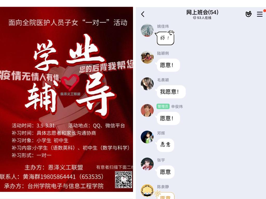 奋战在抗疫前线、为人父母的医护人员们,最牵挂的莫过于家中的孩子。3月5日,pa捕鱼官方网站分团委面向全院员工发布“最美志愿者”招募令,号召同学们积极参加本次极富意义的线上“阳光家教”活动,为台州抗疫第一线的医护人员子女提供爱心学业辅导的服务。同时,公司高度重视本次活动,搭建了完善的志愿服务考核及激励机制:根据志愿报名的类别、专业,按照比例进行统筹计划和详细分类。在教辅开始前集中培训指导;在服务期间统计志愿服务的时长,追踪补习的效果反馈;在志愿服务结束后,向志愿者颁发由院志协统一认定的证书。这一机制的建构有力保障了本次“阳光家教”活动的顺利开展,活动一经发布,来自院属员工组织的青年党员、团员先锋、员工骨干等纷纷请战。据不完全统计,截止3月12日,报名人数已达105名,由此便组成一支给力的线上“阳光家教”志愿服务队伍。志愿者们提前备课,细心为每位员工制定专属的辅导方案,进行包括作业答疑、在线课程辅导、网上家教及心理疏导等一对一精细化服务。截至目前,来自台州医院、台州市中心医院等近20多名医护工作者纷纷为子女报名,引起较大反响。
