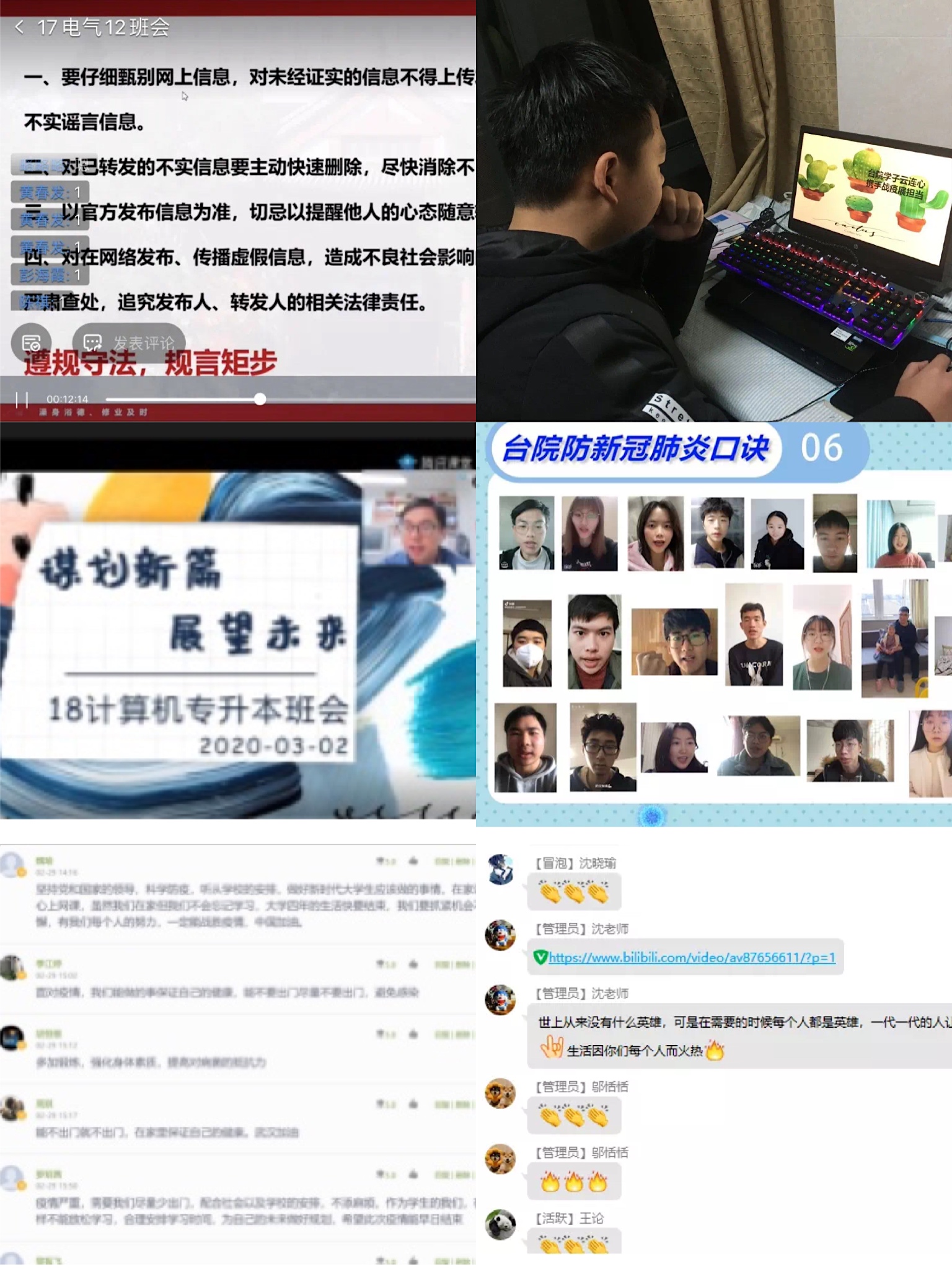 本次线上主题班会,pa捕鱼官方网站各年级辅导员、班主任带领同学们围绕老员工紧密结合当下疫情防控实际,分别从“主动担当、听党指挥、珍惜生命、致敬英雄、加强自律、关爱心灵、谋划新篇”等7个方面入手,向同学们传达了公司的相关文件精神和教学安排,并强调同学们要积极配合公司的相关工作,每日按时打卡上报健康情况,未经允许,不得提前返校,坚决贯彻落实“零报告”制度,做到不缓报、不漏报、不误报和不瞒报。在做好疫情防控的主题教育和思想政治教育的同时,公司同样重视员工的在线教学工作,尤其强调特殊时期的班风、学风建设问题。班主任、辅导员通过线上班会了解了员工目前在线学习的准备状况和存在的实际问题,做好心理疏导和在线帮助工作。对员工尤为关心的补考、转专业及在线教学的具体问题,班主任、辅导员也进行了热情、具体、详细的解答。