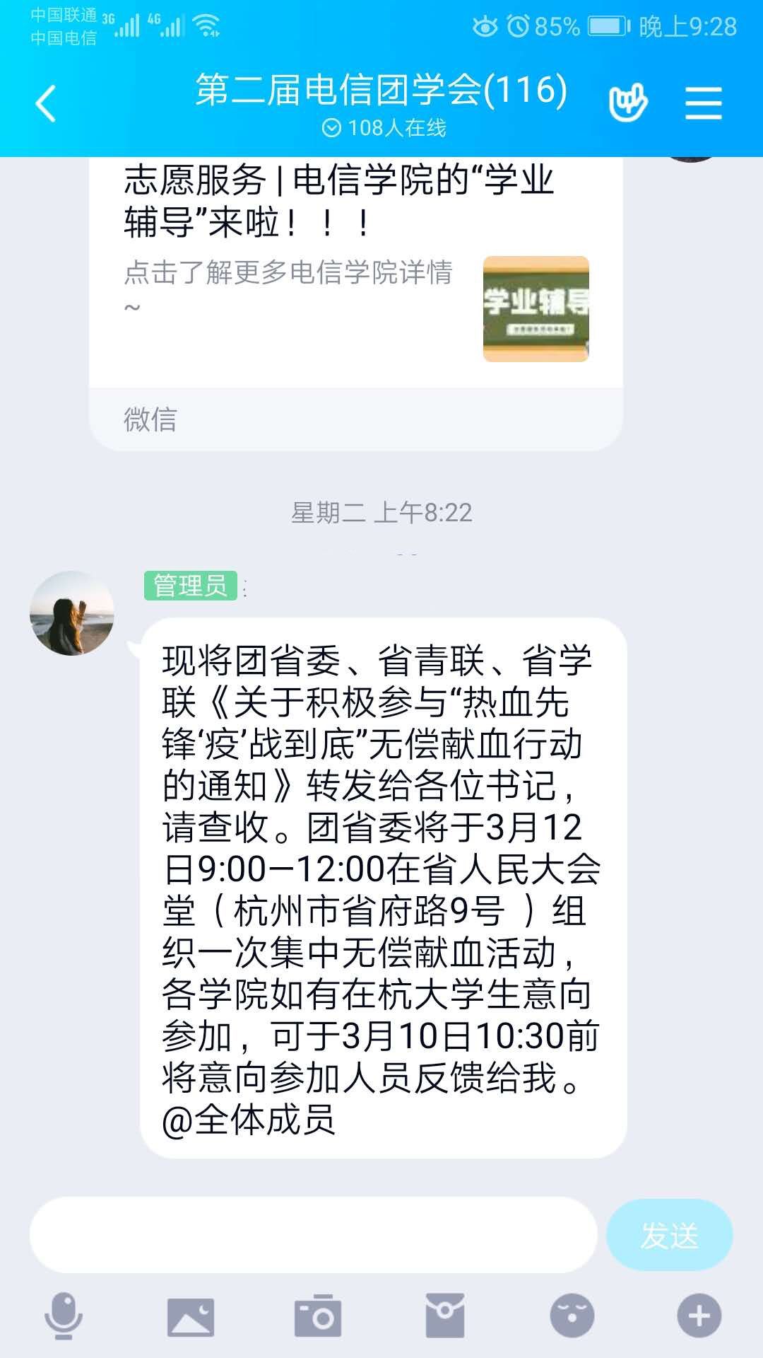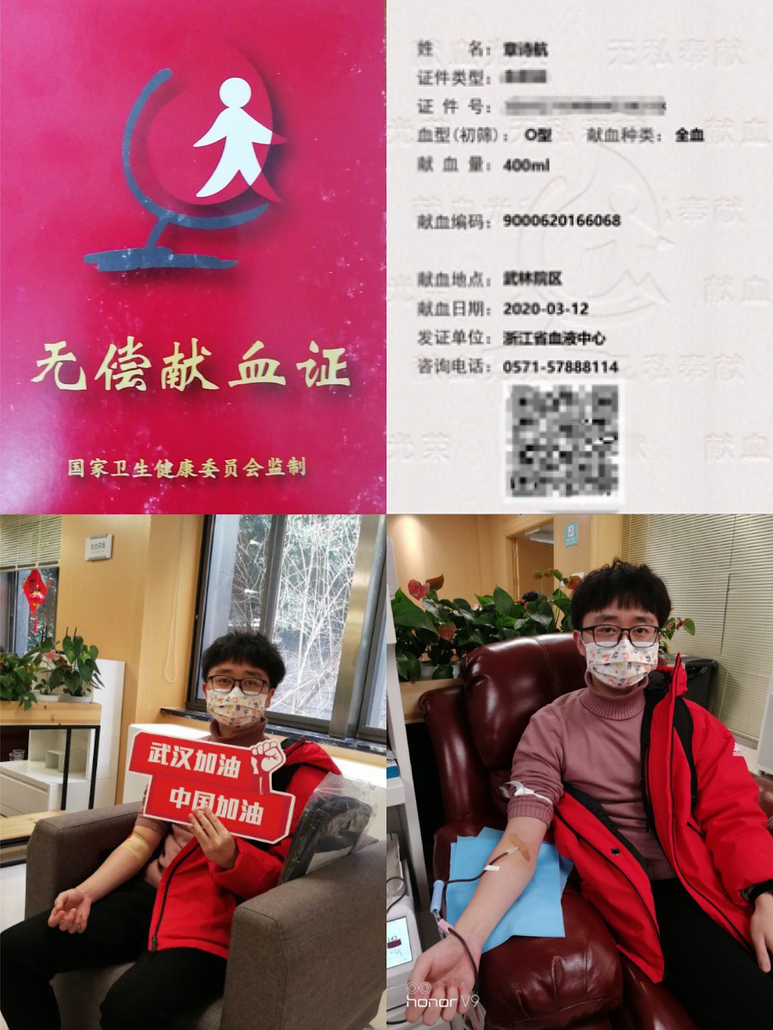 去年植树节我们忙于播种春天的树苗,而今日电信学子走在热血抗疫的路上。早晨浓重的大雾弥漫在天地之间,并未阻断章诗航同学既定的行程。他一大早就出发赶往武林院区献血中心,即便身后是家人对于疫情期间出行的担忧,这位少年仍坚定实现献血的心愿。坐了半个小时的公交后,再走大约一个小时的路终于到了献血站。他说:“非常时期血液紧张,虽然来的时候有些坎坷,但是想到能给别人带来希望还是很开心的”。