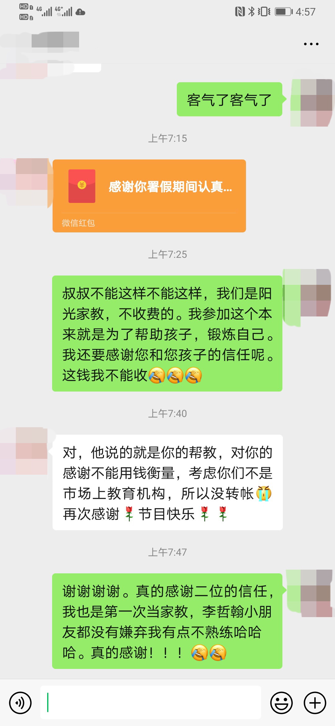 本次“阳光家教”暑期实践活动虽然已经结束,但留给所有人的影响和意义深远。就像季同学所说,本次公益阳光家教对他而言是一次不错的锻炼和实践的机会,在和小朋友的相处中也感受到了幸福和满足,很开心能够帮助到他们。传递知识,传播爱心,“阳光家教”的温暖还在传递,pa捕鱼官方网站学子定将不忘初心,砥砺前行!