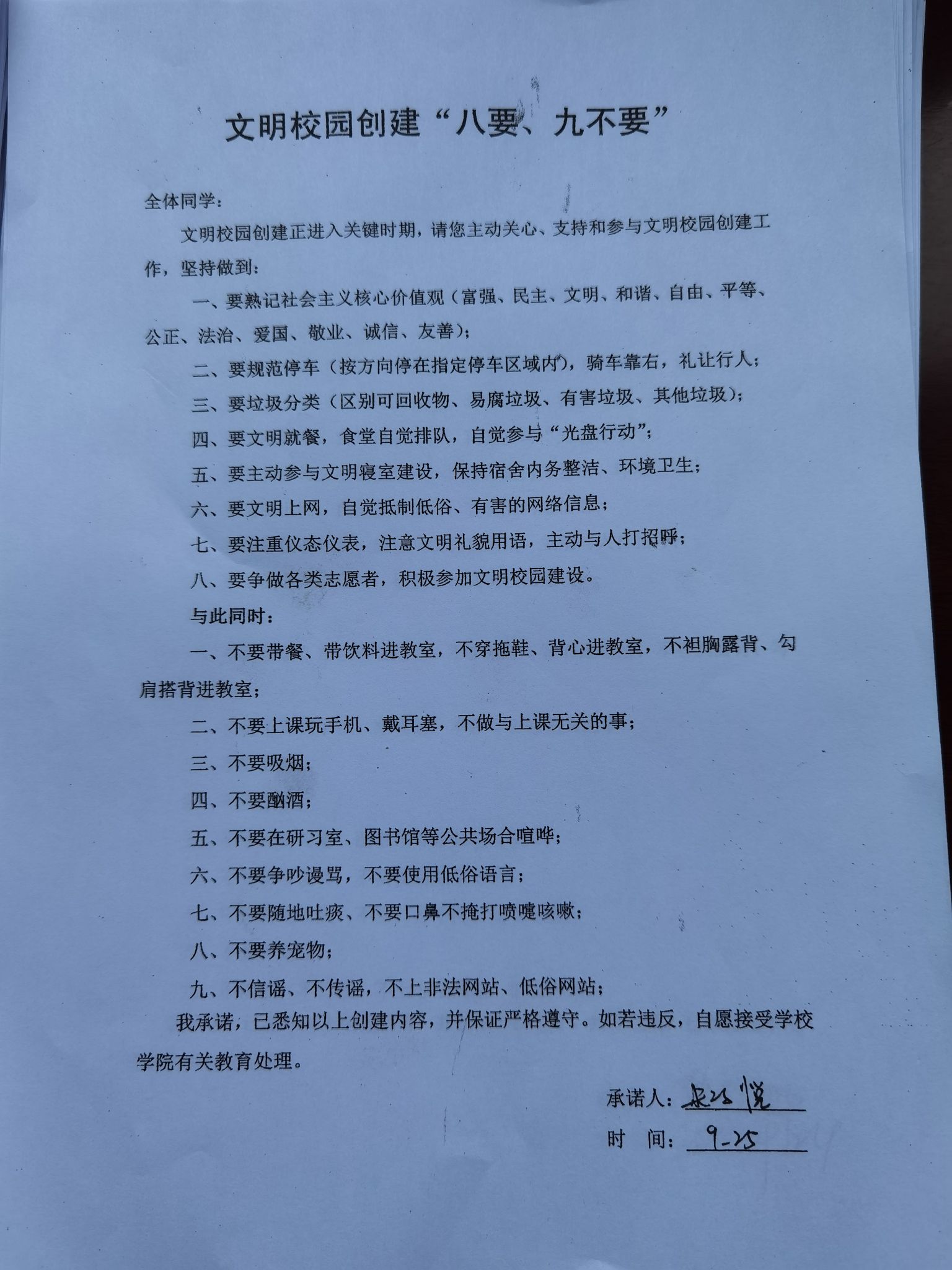 9月25日,公司召集全体网格员召开全国文明城市创建工作部署会议。会上进行了详细工作部署,合理安排分工,每个人做到守土有责,确保不漏一处;明确工作职责,做到责任到人;强调工作纪律,按时到岗到位。会后各寝室集体领取并签署了《文明校园创建“八要、九不要”承诺书》。