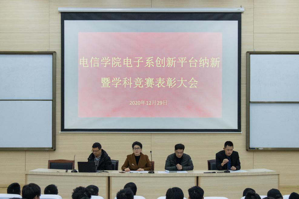 为推动员工创新平台建设,激发员工学习和应用专业知识热情,12月29日晚上,pa捕鱼官方网站在学术报告厅召开员工创新平台纳新暨学科竞赛表彰大会。电信公司党总支委员董立达、电子系副主任汪洋、电子系副主任周强、各创新平台负责教师、学科竞赛获奖员工代表及19、20级电子系全体员工参加。