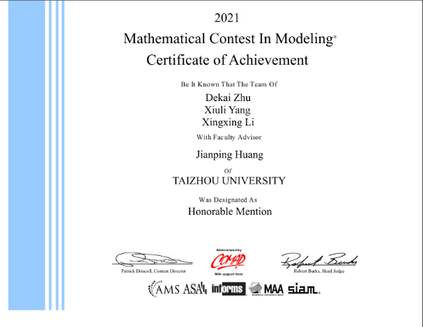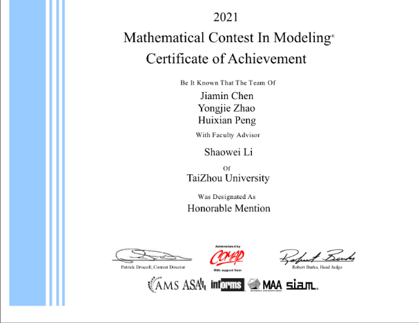 近日,2021年美国国际老员工数学建模竞赛(MCM)与交叉学科建模竞赛(ICM)公布了获奖名单,由pa捕鱼官方网站)李韶伟老师指导的陈佳敏、赵勇杰、彭慧娴一组同学和黄建平老师指导的朱德凯、杨秀丽、李星星一组同学都获得了Honorable Mention奖,这是继去年公司收获一组Honorable Mention奖之后的又一次突破。