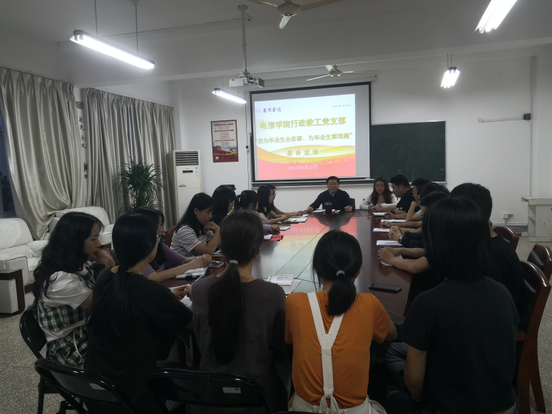 为深入开展“我为毕业生办实事、我为毕业生解难题、我为毕业生减负担”专题实践活动,6月21日,电信公司分校区召开了毕业生座谈会。党总支副书记、行政教工党支部书记冯荣、党总支委员董立达,支部党员教师代表、各年级辅导员及17级员工代表参会。