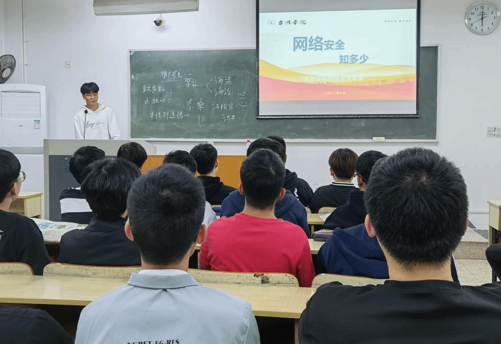 网络安全教育主题班会上,班委围绕网络诈骗主题,向同学们介绍四大网络陷阱、校园贷的情况,提醒同学们谨慎使用网络。由八个实际案例出发,向同学们展示潜藏身边的网络诈骗、对应的防范措施。最后,班委总结了同学们在面对网络诈骗时,可采取的三大防范措施以及相关防范细节。