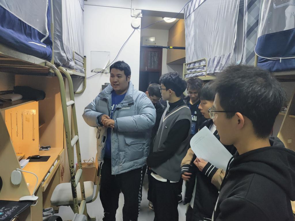 安全隐患排查。检查宿舍内有无电磁炉、电饭煲等大功率电器;有无煤气炉(罐)和易燃易爆物品;有无私拉乱接电线、插座;有无藏放管制刀具等械具;有无饲养猫、狗等宠物;宿舍的天花板有无爆裂、渗水、脱落等现象;宿舍的门窗、阳台部位及走廊过道有无放置影响逃生及灭火救援的障碍物。