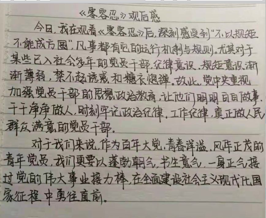 《零容忍》专题的播出让师生们明白制度之下不允许一丝违规违纪违法之势,官员之中不允许一毫贪污腐败之行。师生党员、青年团员们要树立正确的权力观,恪守本心,在党的领导下不忘初心砥砺前行。