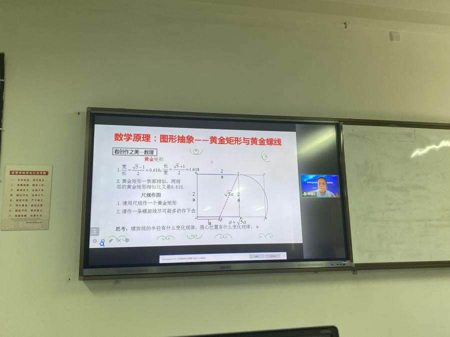 课程之初,吴春燕以鸟叫声引入,通过听觉欣赏与创作,让员工发现在时间布局上音乐中高潮点的特殊,而后由吴海燕用数学中黄金分割比的知识点来对其进行讲解。其次,由郑怡静提出建筑与美术创作中所用到的螺旋线,再由吴海燕用数学语言来讲述螺旋线的画法以及介绍黄金矩形和黄金螺旋线的概念。讲解完知识,由郑怡静带领员工用黄金螺旋线进行艺术创作。接着,郑永斌讲述大自然中所存在的普遍性的等角螺旋线和特殊的黄金螺旋线,由吴海燕对等角螺旋线进行一定的解释。课程末,吴海燕请同学们讲述了对本节课的感受,同时,对本堂课所学的内容进行了小结。