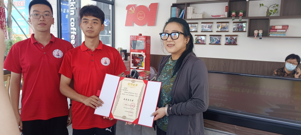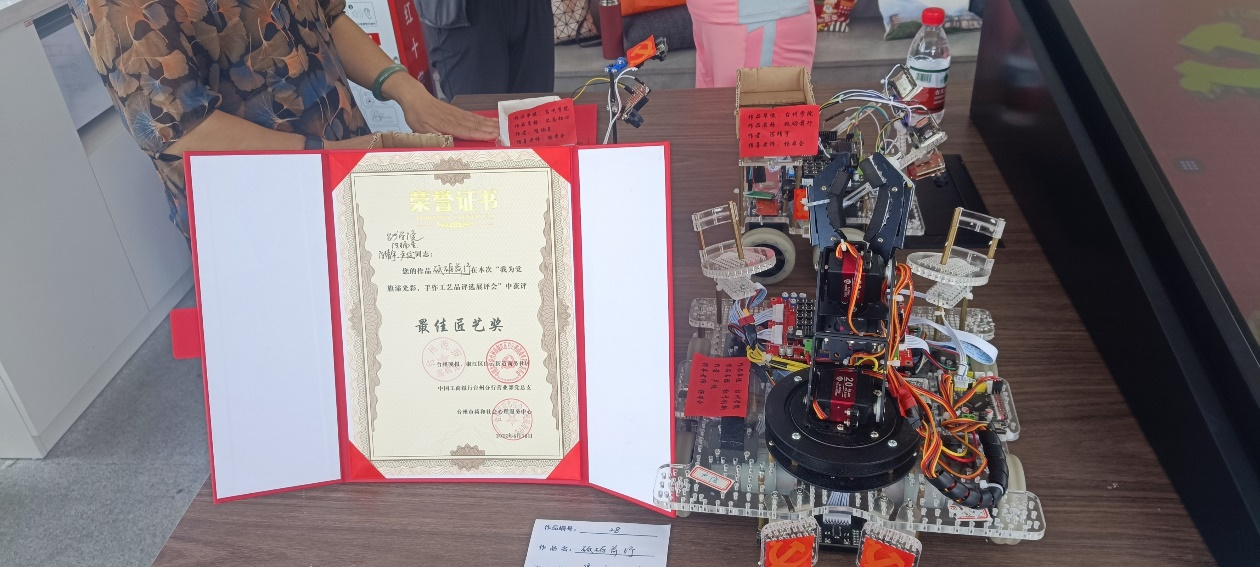 据悉,此次活动由台州晚报、椒江区白云街道商务社区、台州市荷和社会心理服务中心共同举办,共面向社会征集到带有党建元素的手工作品32件,作品展示形式多样,涉及剪纸、刺绣、草编、插花等。通过评委打分,最终评选出“最佳匠艺奖”6件,实践队“砥砺前行”作品获得“最佳匠艺奖”一等奖。