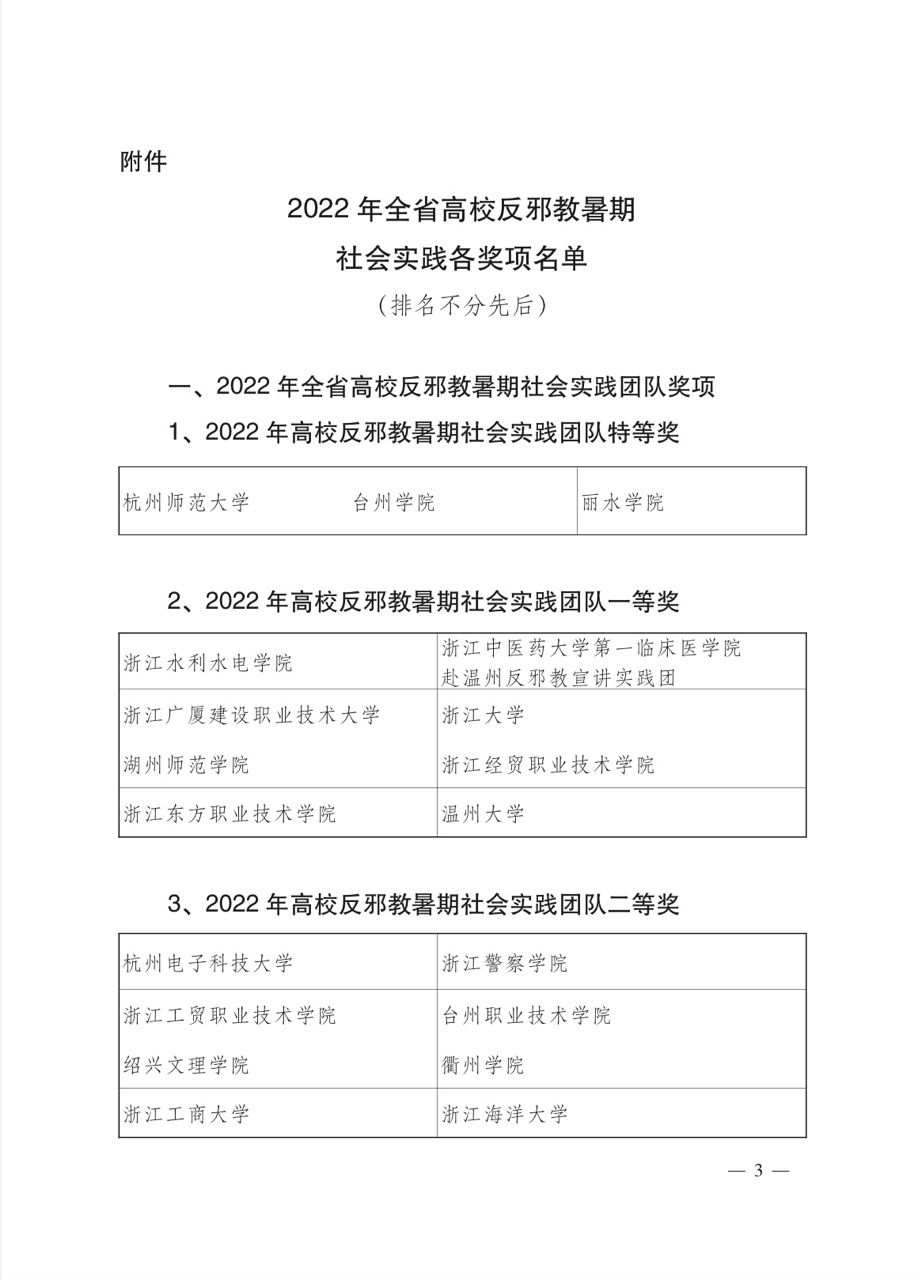 日前,浙江省高等教育学会思想政治教育分会、浙江省员工联合会、浙江省反邪教协会公布2022年浙江省高校反邪教暑期社会实践评选结果。公司pa捕鱼官方网站“青春献礼二十大·聚力同心反邪教”实践团队在全省54支立项的高校团队中脱颖而出,荣获史上最好成绩——特等奖,指导老师冯荣获“优秀指导老师”称号;实践队员王琮蓉获“先进个人”称号,应佳瑶获“优秀员工干部”称号。