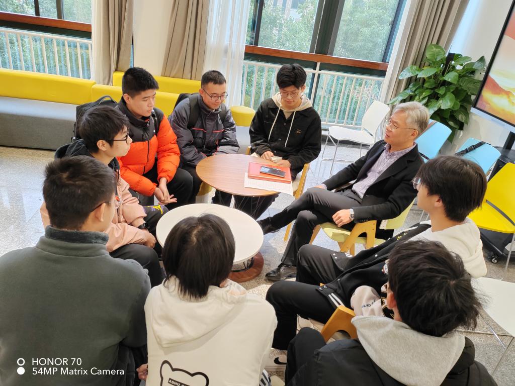 杨健国与同学们围坐一圈,仔细了解同学们的思想与生活情况,认真聆听同学们的学业情况与未来规划,对他们遇到的困难与问题一一进行分析并解答。他勉励同学们,要尽早设立目标并为之持之以恒地努力,特别是要学会时间管理,合理分配学习与娱乐时间,走出寝室,走向教室、实验室、运动场,让大学四年时间价值最大化。他同时希望同学们能够互助友爱,在比学赶帮超的热潮中建立宝贵友谊,建设和谐寝室。他还提醒同学们遵守属地疫情防控政策共同呵护校园安全,注意天冷添衣做好个人防护,遇事冷静多思考,明辨是非不跟风,有困难及时和老师们联系寻求帮助。