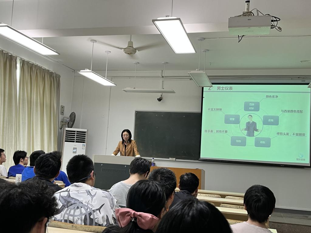课上,惠鑫围绕面试前的准备、面试礼仪与服饰、面试应对策略、面试常见问题、面试后该做的工作,以及形态礼仪、职业礼仪、服饰礼仪与办公室礼仪等方面进行讲授。引导同学们从HR的角度去看待面试,围绕HR的考核重点,如:匹配性、成长性、稳定性等方面去准备面试;针对职场的礼仪要求,如穿着、赴约、行进、坐姿等方面去注重修养。惠鑫还指导同学们如何做好自我介绍、如何回答面试问题、如何塑造职业信念等,以及面试前对公司信息、岗位信息、简历内容、仪容仪表、面试常见问题等方面的准备。