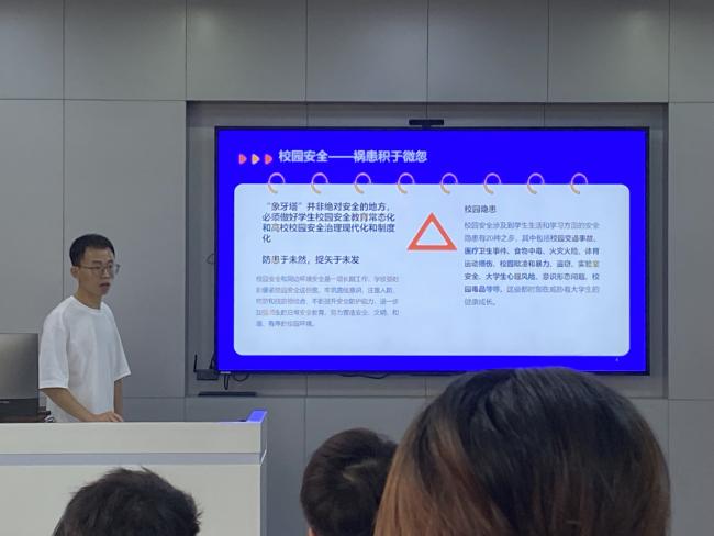 会上,两位老师对各种安全问题和真实案例做了详细讲解,就假期安全问题做出三点强调:一是鼓励假期留校员工要合理安排时间,文明上网,劳逸结合,注重自身心理健康,学会采取正确方式释放压力。同时要注意宿舍用电、消防、食品以及校园交通安全,杜绝一切安全隐患。做校园安全和自我健康安全的第一责任人。二是提醒假期有出行安排的同学,要注意个人人身安全,减少和避免参加危险户外活动,提高防范意识,掌握必要的自救技能;警惕网络电信诈骗和陌生人借款、刷单兼职、信贷等问题,提高自我保护意识;三是在政治安全方面,教育同学们爱党爱国,拥护社会主义,警惕西方文化渗透和文化霸权的输出,贯彻全民反间谍的安全方针,提高政治素养,构筑政治安全大局观。会上还宣读了国家宗教政策,告诫同学们严守校园宗教“六严禁”,严禁参加非法宗教活动和秘密集会等,遵守各项规章制度。