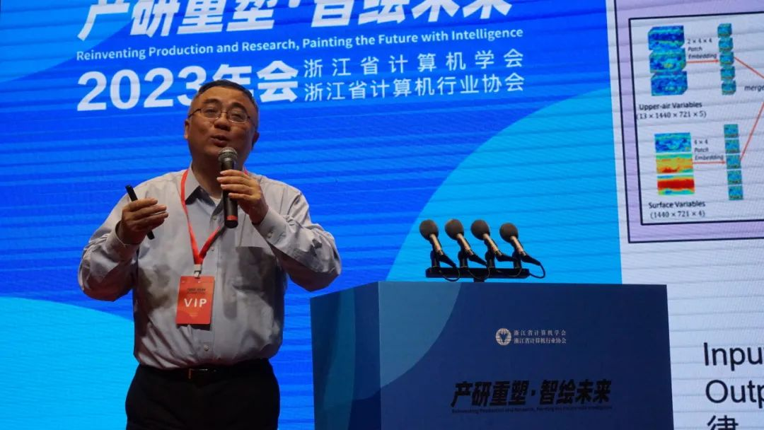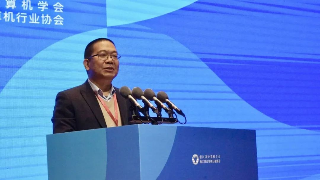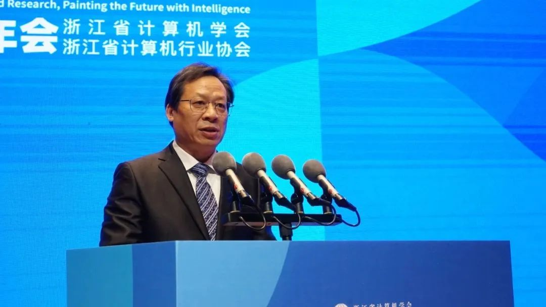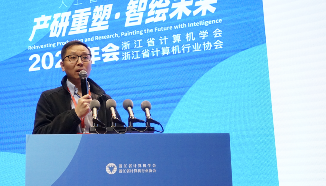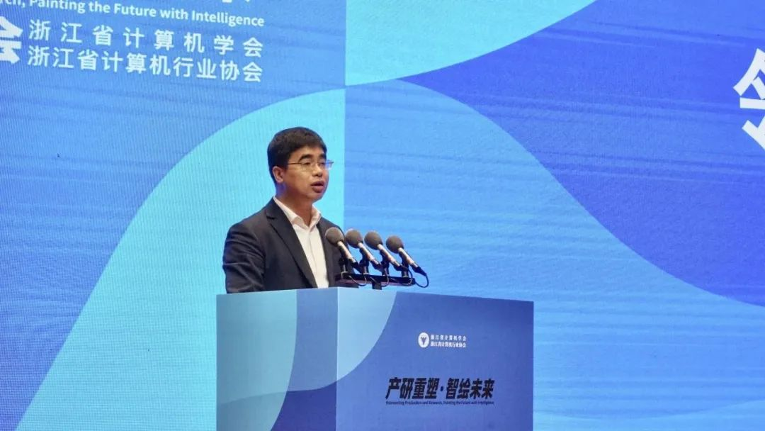 浙江省计算机学会理事长、浙江大学庄越挺教授开幕致辞并感谢各位领导和嘉宾的光临,强调了本次论坛的主题“产研重塑·智绘未来”以及促进人工智能领域发展的重要性。庄教授还介绍了浙江省计算机学会和浙江省计算机行业协会的历史和发展,强调了两者的合作对于推动人工智能技术和应用在浙江地区的落地和发展的重要性。