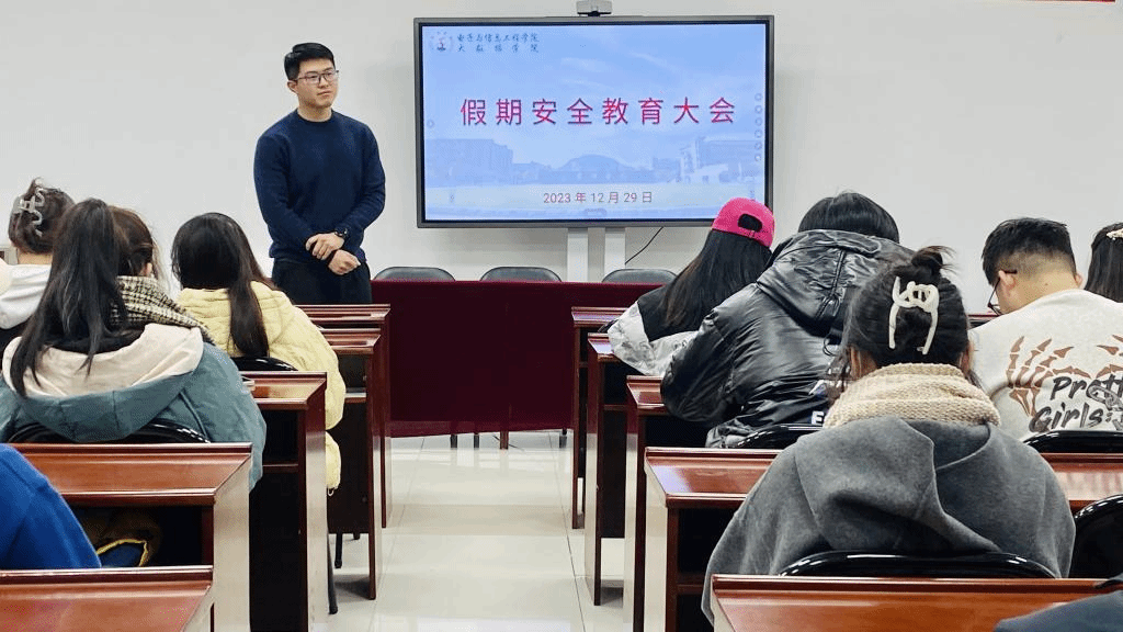 负责安全工作辅导员就政治安全、交通安全、消防安全、人身安全以及防电信网络诈骗等方面开展教育。他详细介绍了一系列安全事件应采取的具体措施,并结合假期生活中常见的典型事故案例进行讲解,提醒同学们要时时、事事、处处注意安全。