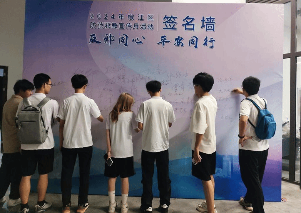 启动仪式开始前,实践队队员们便满怀热忱地聚集在“反邪同心、平安同行”姓名墙前。这面墙不仅承载着物理上的重量,更寓意着每一位参与者对反邪教事业的坚定信念与共同承诺。成员们逐一拿笔,郑重地留下姓名印记,这不仅仅是对个人参与的确认,更是对维护社会和谐稳定、促进校园文化健康发展的庄严宣誓。