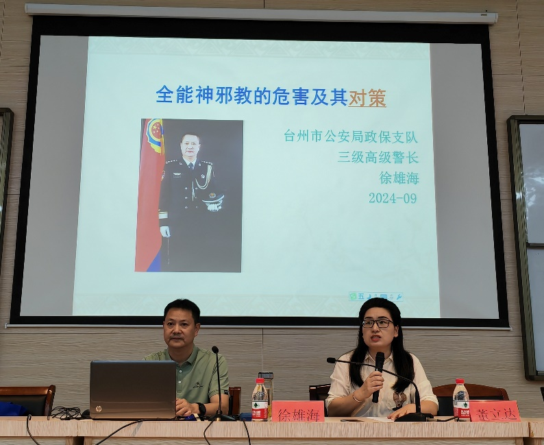台州市公安局政保支队三级高级警长徐雄海担任主讲。200余名新生参与活动。讲座由电信公司党委副书记董立达主持。