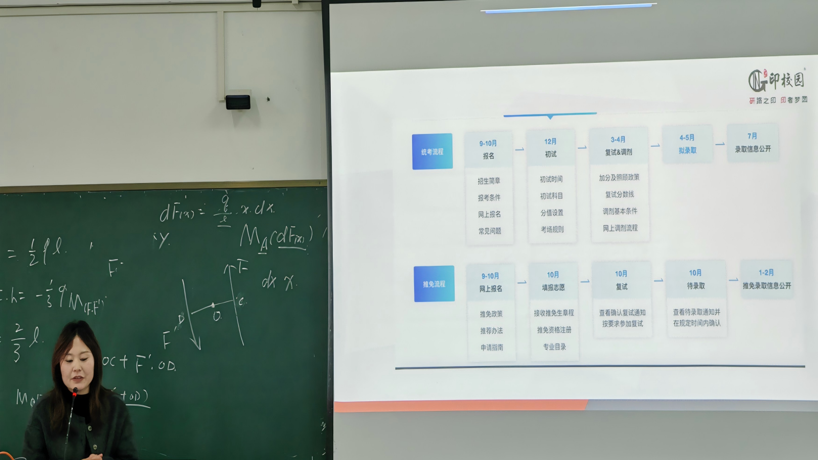 会上,赵晋婷先从考研的动机,考研的好处,考研人数的变化进行了宣讲,使同学们对当前考研形势和相关政策有了进一步了解。同时,他结合多年考研指导经验,对大数据科学与技术专业的主要备考专业方向、初试备考主要选择的备考老师,如何选择合适的公司等问题给予了解答,明确了专业发展前景,鼓励同学们树立考研信心,提前做好考研规划。