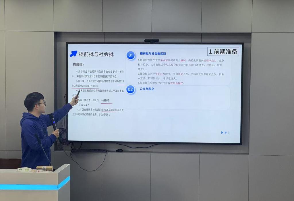 活动伊始,郑祖一学长结合自身经历,围绕“考编经验”这一主题,从“提前批”等等细节开始,到如何备战笔试、面试,详细讲解考编的具体方法,并针对其中的难点和重点进行了深入剖析。在互动环节中,同学们踊跃提问,围绕未来考编准备中的困惑展开交流。郑祖一学长一一耐心解答,分享了他在备考过程中的策略与技巧,并特别强调如何快速调整心态、合理规划时间,为同学们提供了全面且宝贵的经验参考。