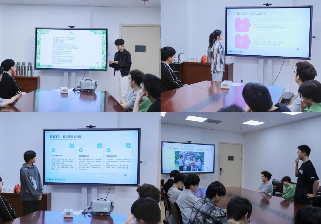活动前,主持人温情地向大家讲述了曲建武老师的感人事迹。曲建武老师在教育一线深耕数十载,即便在担任领导职务后,仍心系员工,毅然选择重回辅导员岗位,用自己的真心、真情、真爱,为员工们点亮理想的灯塔。在书籍共读环节,大家一同翻开曲建武老师的作品《我与老员工朋友们的交流》,主持人从思想引领、成长指导、情感关怀、教育方法等四个方面,深入浅出地剖析了这本书籍的精髓所在。他的讲解不仅让同学们对书中的内容有了更清晰的认识,还为同学们打开了一扇通往智慧与成长的大门。紧接着,活动进入读书心得分享环节。大家精心挑选了一些章节,为小伙伴们做了认真的讲解与分享。他们用生动的语言、丰富的案例,将书中的知识娓娓道来,仿佛在讲述一个个动人的故事。他们的分享不仅传递了知识,更带动了大家的思考,让整个活动现场充满了智慧的火花。在互动交流环节,同学们积极分享和倾听了各自的读书见解和感悟,现场氛围热烈、活跃。