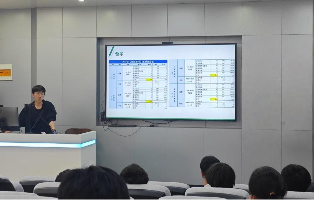 活动伊始,朱梓滔学长结合自己的亲身经历,围绕主题从 “认知” 角度展开介绍,深入剖析现今考公形势与方向,并细致讲解如何查看实时招考公告等资料。他毫无保留地畅谈备考历程中的挫折与经验,为同学们的备考提供切身建议,还详细罗列备考资料、学习渠道及学习策略,对不同学习策略给出独到观点。朱梓滔学长恳切的讲解加深了同学们对考公的认识。