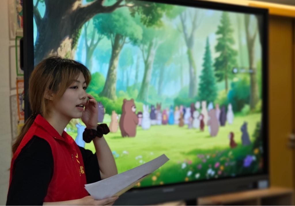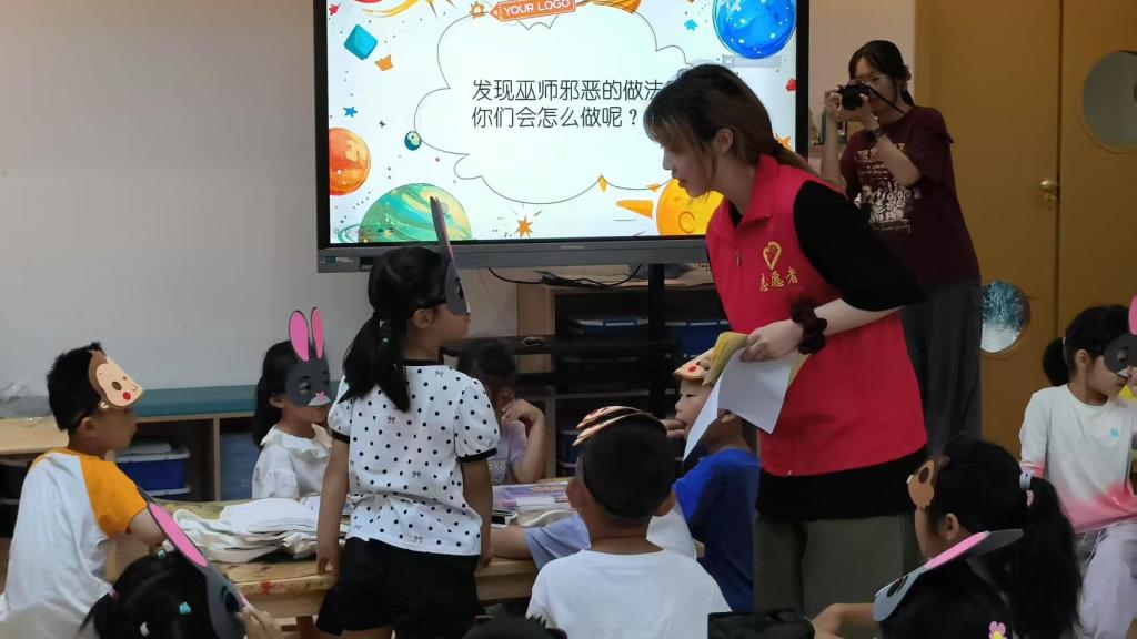 “森林里来了戴尖帽子的‘巫师’!”实践队员以《森林小卫士与坏巫师》动画开篇,将邪教危害类比为“巫师的谎言”。当讲到“魔法糖果诱骗”情节时,孩子们立刻呼应“不能吃陌生人东西”。PPT中动态森林场景成为活教材:小松鼠拒绝“包治百病”咒语、小兔子向护林员求助,队员们用“糖果诱惑”“秘密聚会”等贴近生活的设计,让“科学防邪”概念转化为可感知的画面,引导孩子建立“遇可疑情况告诉家长”的安全意识。