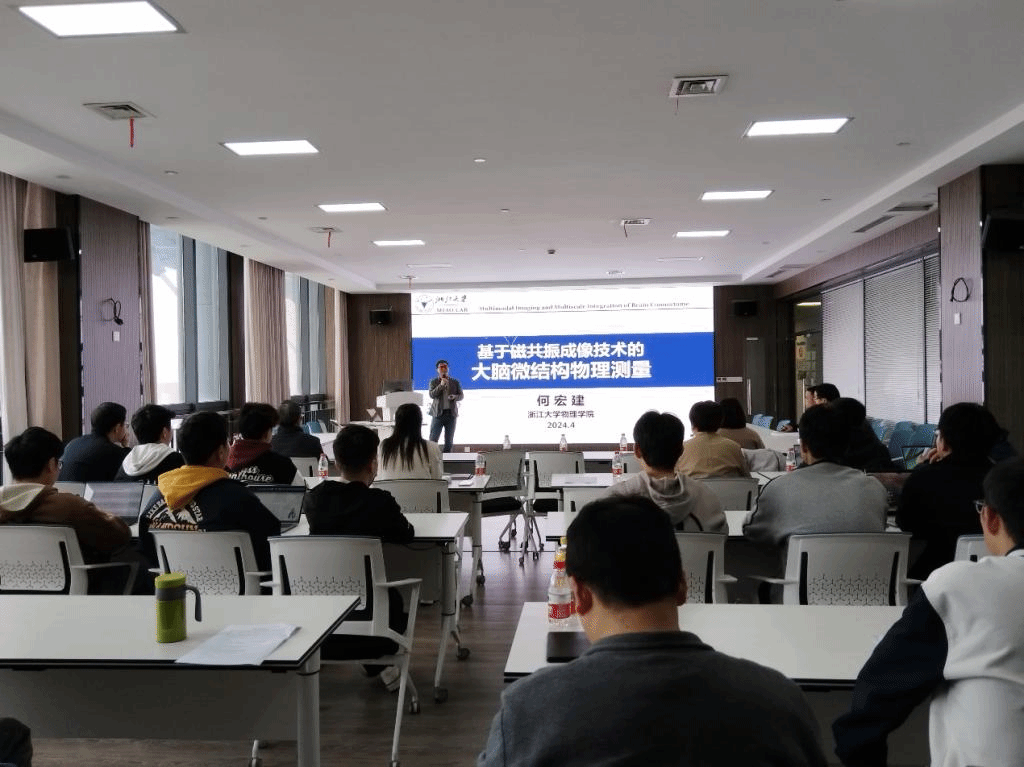 何宏建教授首先作题为“基于磁共振成像技术的大脑微结构物理测量”的学术报告。何宏建教授首先讲解了磁共振(MRI)成像技术的基本物理原理,总结了传统成像方法在成像效率和特异性等方面的限制,重点介绍了通过改进射频脉冲序列提升MRI的成像精度和速度的最新研究进展。