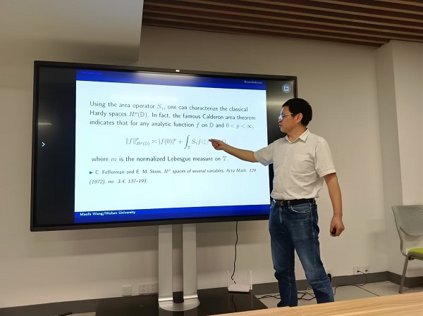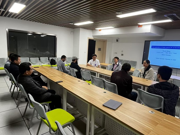 王茂发教授首先介绍了Dirichlet级数空间的研究背景和面积算子的研究现状。随后重点讲解了他们课题组在Dirichlet级数Hardy空间上面积算子的有界性结果研究,并将研究成果应用到Volterra型积分算子的有界性刻画上。王茂发教授的报告深入浅出,不仅了介绍了他们课题组科研工作的前沿进展,也激发了在场数学年轻教师对科研工作的热情。报告后王教授耐心回答了老师们的提问,现场老师也与王茂发教授就一些基础数学中的热点问题进行了深入交流。