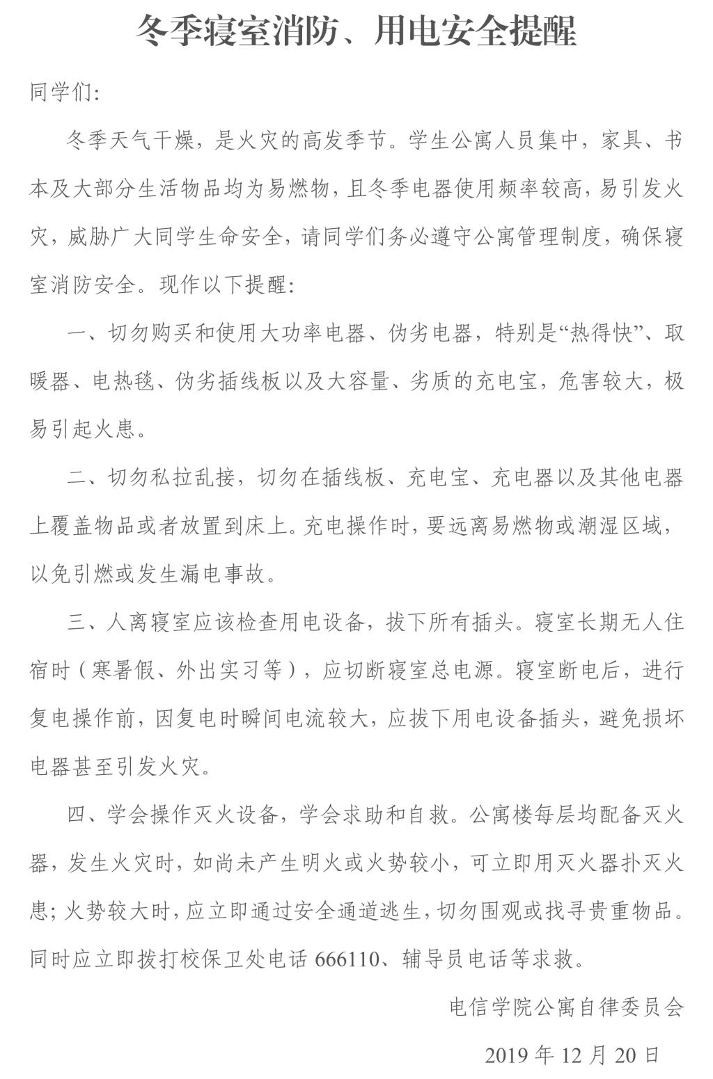 冬季寝室消防、用电安全提醒