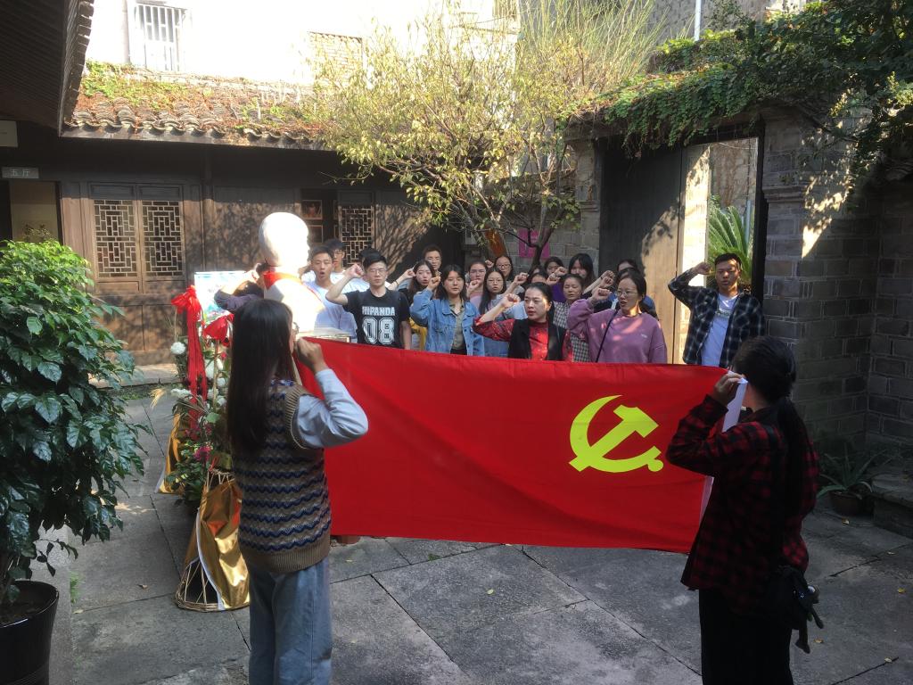 革命先烈郭凤韶的故居就坐落在古街之中,故居院内郭凤韶烈士的塑像正气凛然。讲解员向党员们详细地讲述了郭凤韶烈士的一生概况,郭凤韶烈士视革命为第一生命,早已将自己的生死置之度外。随后,讲解员组织党员们观看了讲述郭凤韶烈士事迹的《雨花台》、《永远的丰碑》等电影片段,使大家对郭凤韶烈士的敬仰之情油然而生,她的奋不顾身、大义凛然和英勇无畏,犹如她所画的《且向百花头上开》红梅图,冷艳且香,傲气坚强。活动中,员工支部书记带领大家面向党旗庄重宣誓,在烈士故居重温申请入党时的思想激情和奋斗追求,不忘初心,牢记使命。